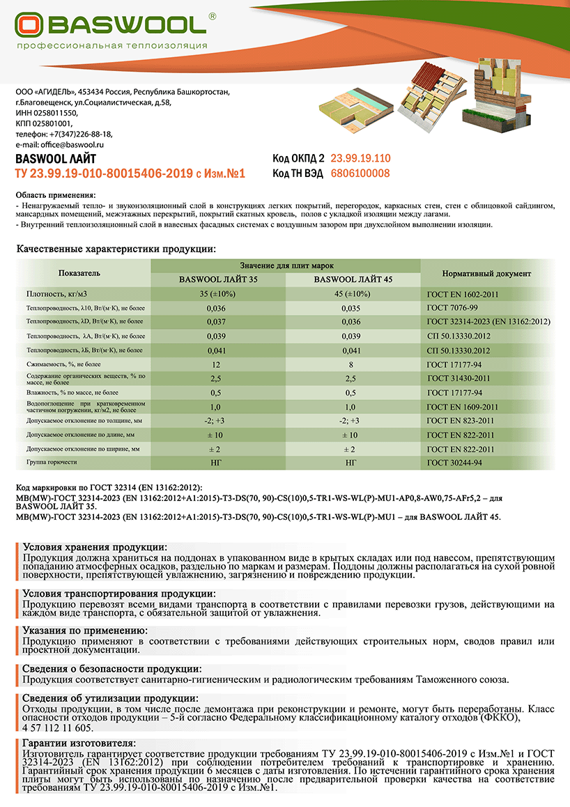 Утеплитель Басвул Лайт является экологически безопасным материалом, не выделяет никаких вредных веществ. Обладает высокими энергосберегающими и эксплуатационными характеристиками.