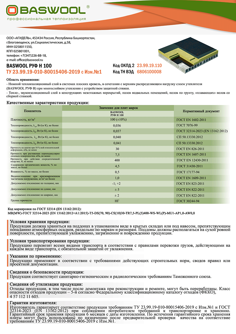 Утеплитель BASWOOL Руф Н - экологически безопасный гидрофобизированный материал, который не выделяет вредных веществ.