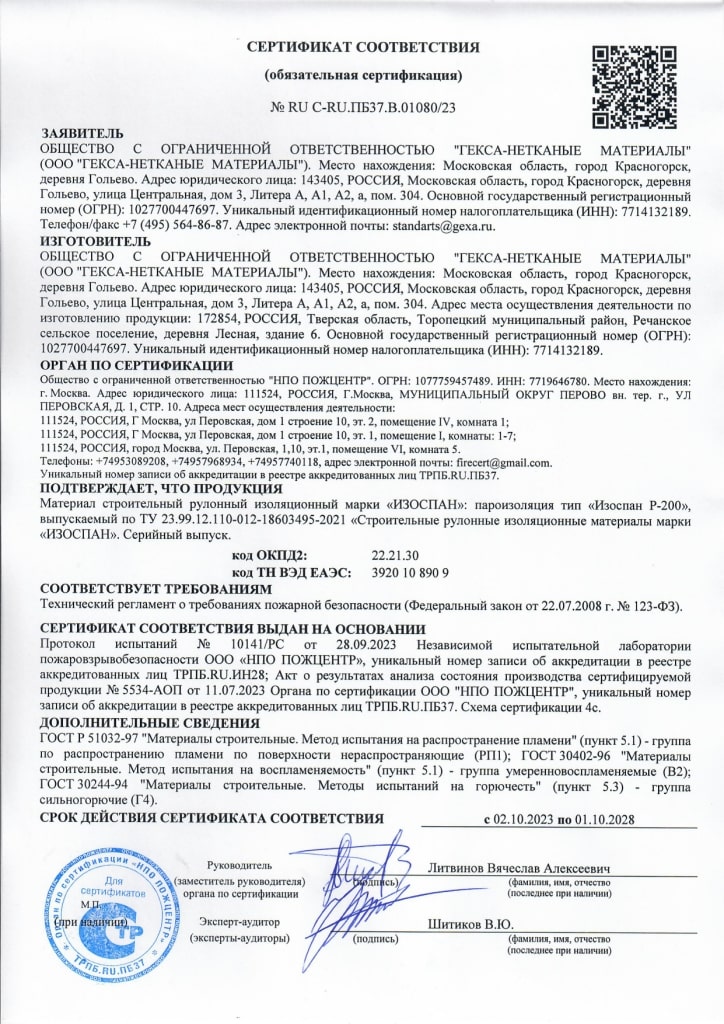 Пожарный сертификат Изоспан р 200 01.10.2028